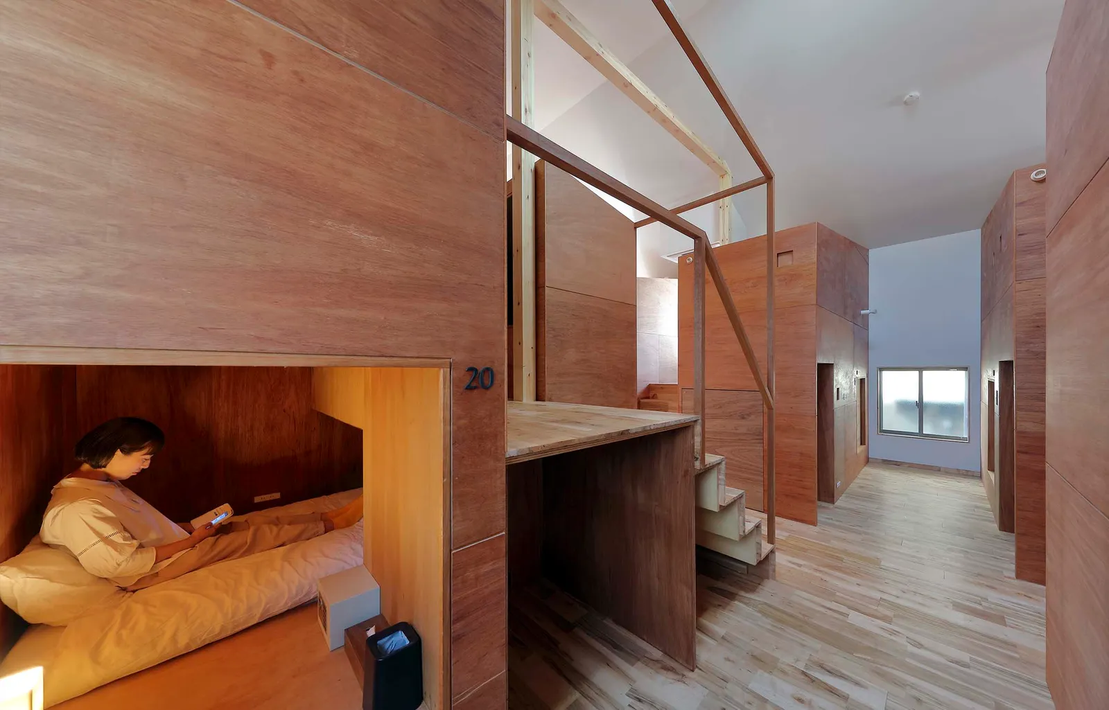 “Delante de la puerta de la cama hay un área abierta para crear espacios sociales. Dado que hay muchas usuarias que comparten pasatiempos similares, hemos diseñado las habitaciones tipo cápsula del segundo piso como un lugar donde pueden relajarse en grupos, como en una pequeña aldea”, explican desde Alphaville.
