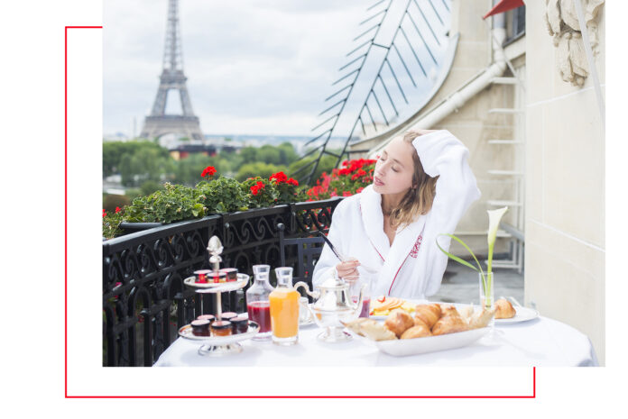 Los huéspedes se alojan aquí en un lujoso confort con vistas a la Torre Eiffel o al encantador patio con sus característicos toldos rojos, perfecto para cenar al aire libre en verano y que en invierno cuenta con su propia pista de hielo. Las románticas vistas de las habitaciones a la Torre Eiffel se han convertido en una de las fotos del hotel más vistas en Instagram.