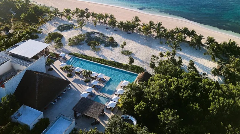 Costo aproximado: $1.000–$2.200 USD por noche (media pensión). Es el hotel boutique de Tulum con las vistas al mar más puras y relajantes.
