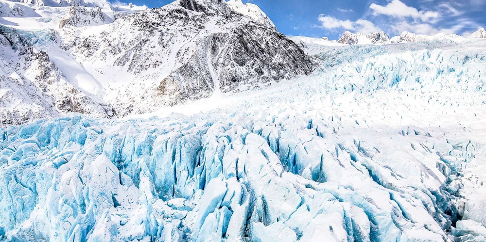 Franz Josef Glacier, en West Coast, Nueva Zelanda, de 12 km, narra la era post-glacial con sus cuevas de hielo y ríos de deshielo que revelan sedimentos de 30,000 años. Su avance histórico y retroceso actual es un libro abierto.